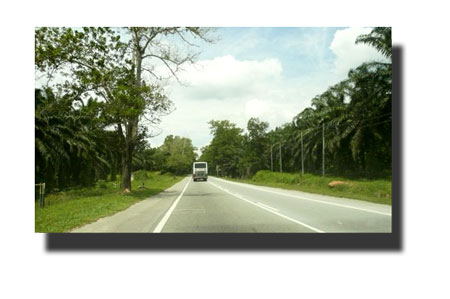 このような道をひた走ります。ジョホールバルから1時間半くらいです。周りはアブラヤシのプランテーションがどこまでも続きます。