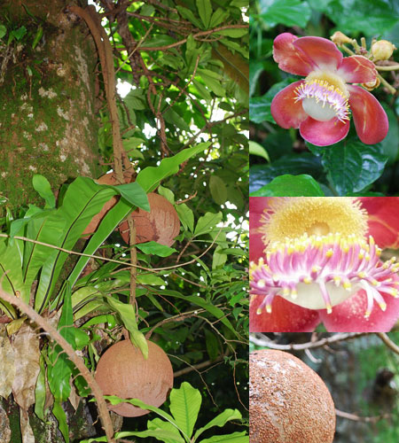 この植物は キャノンボールツリー(砲丸木)と言われています。これを初めて見たときはダイナミックさにびっくりしました。また花がとてもきれいで大きいです。大きな木でこの花と実がついている様子はみごとです。植物園はもちろん街中にもあります。